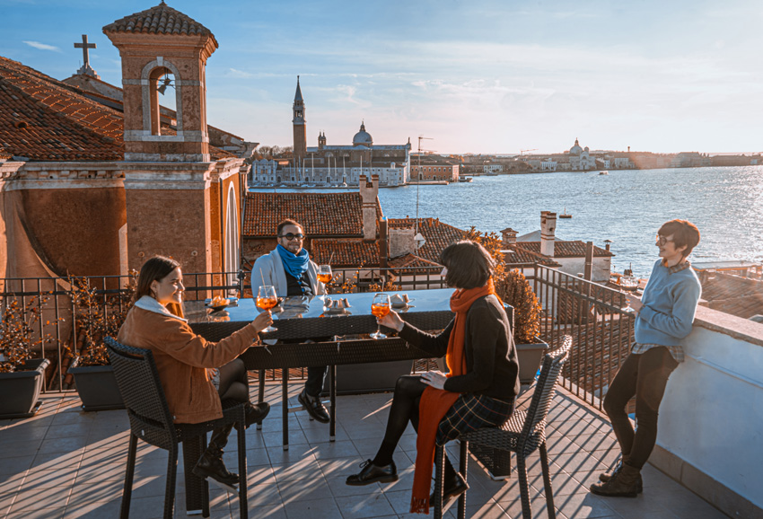 On top of all that, the amazing panoramic roof-top terrace among the roofs of Venice, which gives a unique view on San Giorgio Island and the rest of the city: art and beauty, indoor and outdoor, this is Venice.